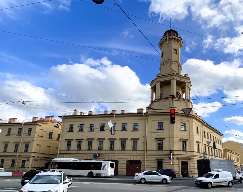 Перейдя через Садовую и обернувшись назад, рассмотрим комплекс зданий съезжего дома Спасской части, доминантой которого, да и всего района, является угловое трехэтажное здание пожарной части с восьмигранной каланчой высотой 46 метров (Б. Подьяческая, 26/ Садовая, 58). Существующий облик съезжий дом приобрел в 1844-1849 годах после перестроений по проекту архитекторов Александра Яковлевича Андреева и Василия Егоровича Моргана. Каланча имеет три смотровые площадки, на которых постоянно дежурили дозорные. Увидев пожар, они вывешивали на каланче черные шары, а ночью – фонари.