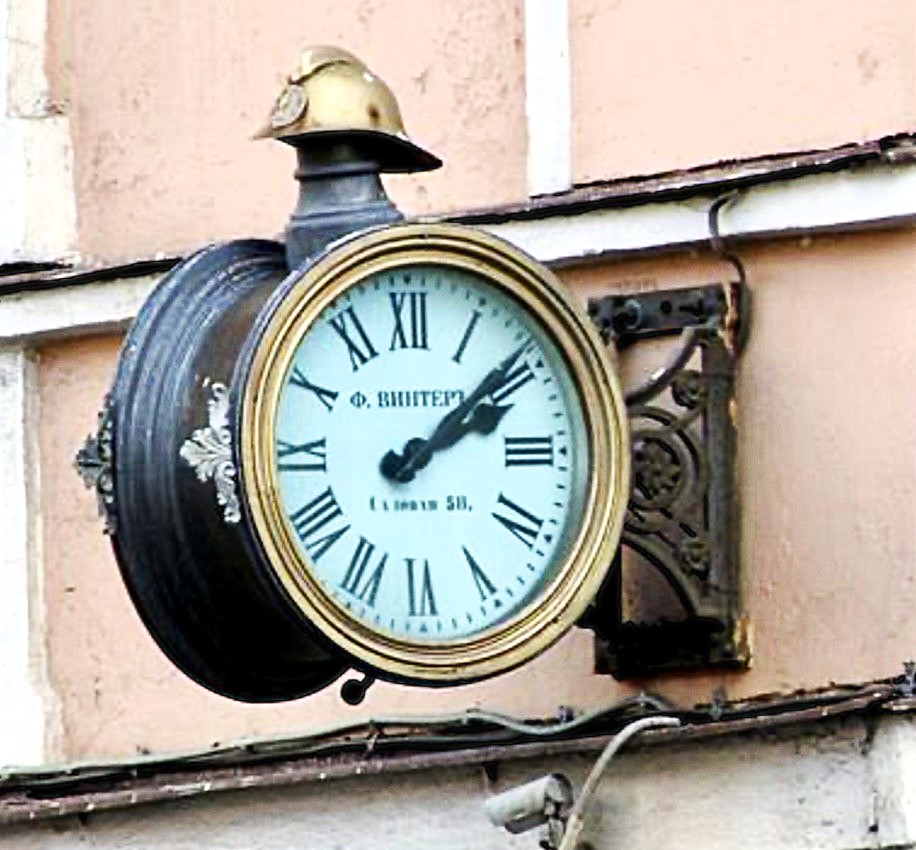 Любознательные краеведы обратят внимание на оригинальные, во всех смыслах, часы фирмы «Фридрих Винтер», установленные на углу здания выше пешеходного светофора. Циферблаты этих часов не параллельны друг другу, адрес (Садовая 58) нанесен прямо на циферблат, а сверху часы украшает пожарная каска.