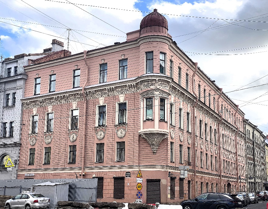 В 1911 году дом получил респектабельный облик – по проекту архитектора Константина Николаевича де Рошефора он был надстроен шестым этажом с мансардой, которую «маскировали» балюстрада и фигурные щипцы. Острый угол подчеркивала изящная башенка с шатровым завершением и шпилем.