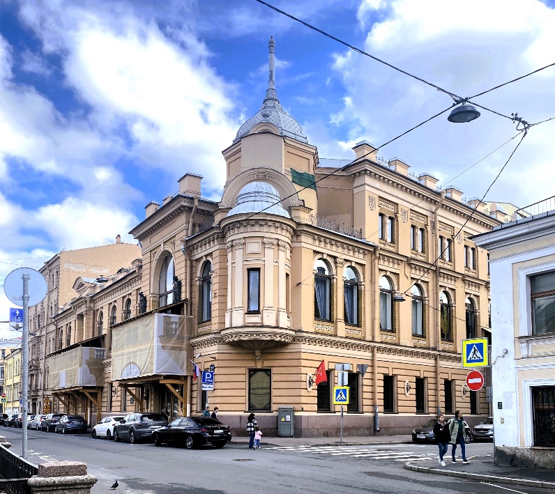 Завершая прогулку, пройдем по Никольскому переулку и вновь, как и в начале пути, окажемся в месте сбора возле Фонтанки. На ходу обратим внимание на высокое здание в стиле модерн, выбивающееся из ряда безликих строений (Никольский пер., 3). Краеведы не имеют однозначного мнения, как правильно атрибутировать назначение этого сооружения, возведенного в 1907 году по проекту гражданского инженера Максима Юрьевича Капелинского. Наиболее вероятным кажется предположение, что это мог быть ломбард, поскольку в начале XX века в городе строились шикарные здания ломбардов, в том числе и для крупных движимостей, как это тогда называлось.