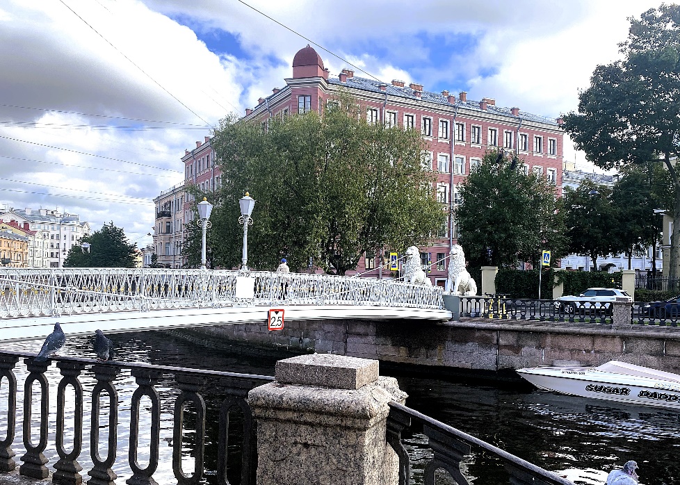 Впереди на нашем пути открывается великолепный вид на пешеходный Львиный мостик – один из знаковых мостов нашего города. Он был сооружён в 1825-1826 годах по проекту инженеров Василия Карловича Треттера и Василия Андреевича Христиановича одновременно с Банковским и Почтамтским. Изваяния львов отлиты из чугуна по модели скульптора Павла Петровича Соколова, автора известной парковой скульптуры «Девушка с кувшином» в Царском селе (ныне город Пушкин). Мост был сконструирован и построен как висячий, но после реконструкции стал балочным и теперь цепи выполняют лишь декоративную функцию.
