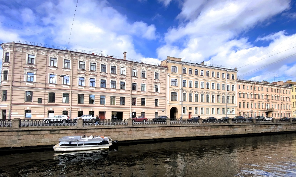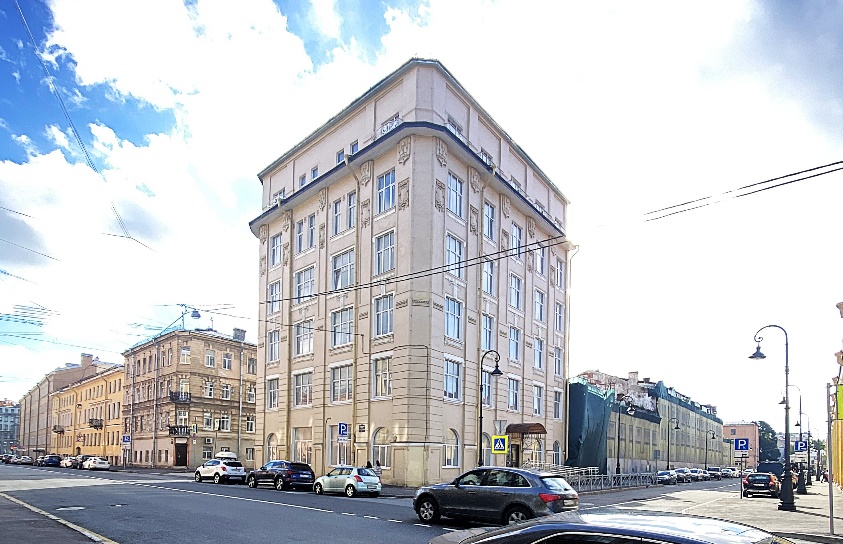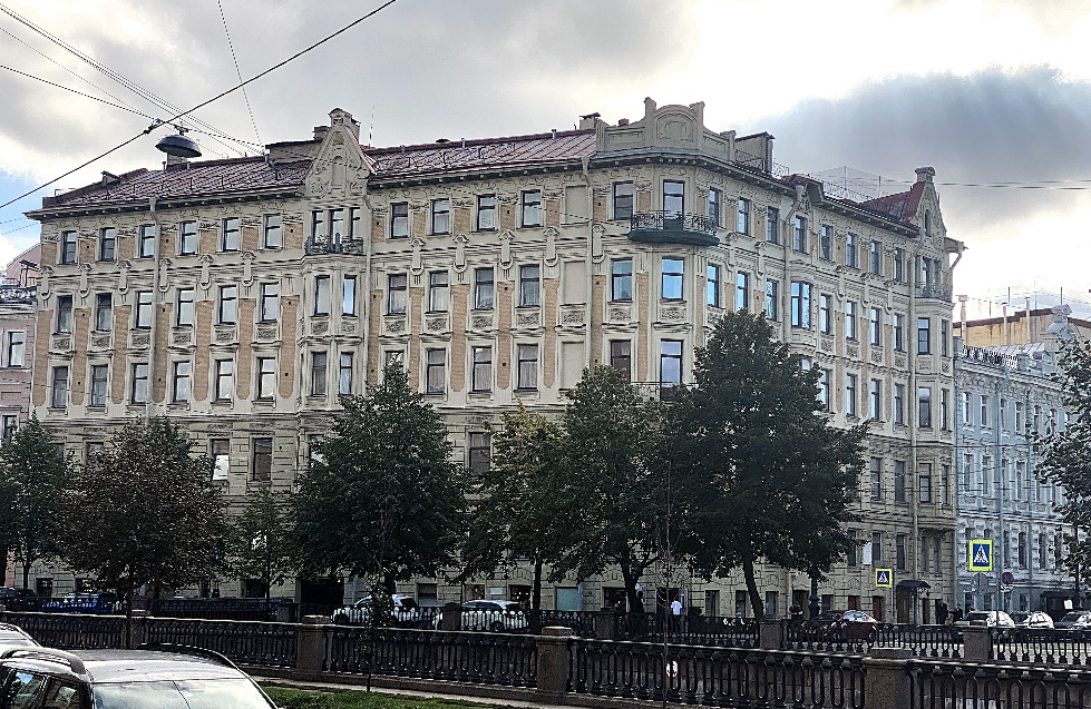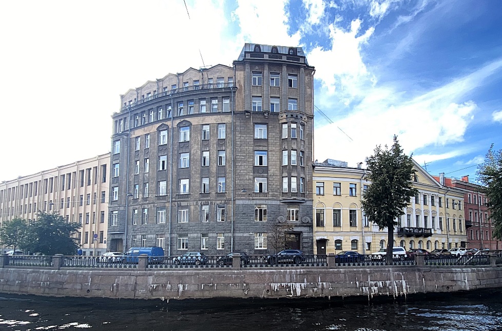 На левом берегу канала, ровно напротив дома Харламова, высится громадное семиэтажное здание, напоминающее утюг, благодаря острому углу с Малой Подьяческой улицей. Фасад дома, имеющий несколько «переломов», стремится следовать за крутой излучиной канала.