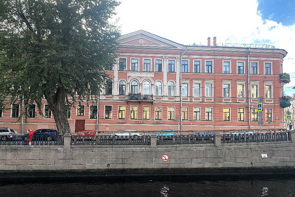 Первая остановка – за перекрёстком со Средней Подьяческой улицей, откуда, обернувшись, рассмотрим во всей красе здание Екатерининского общественного собрания (наб. кан. Грибоедова, 88-90/ Средняя Подьяческая, 2).