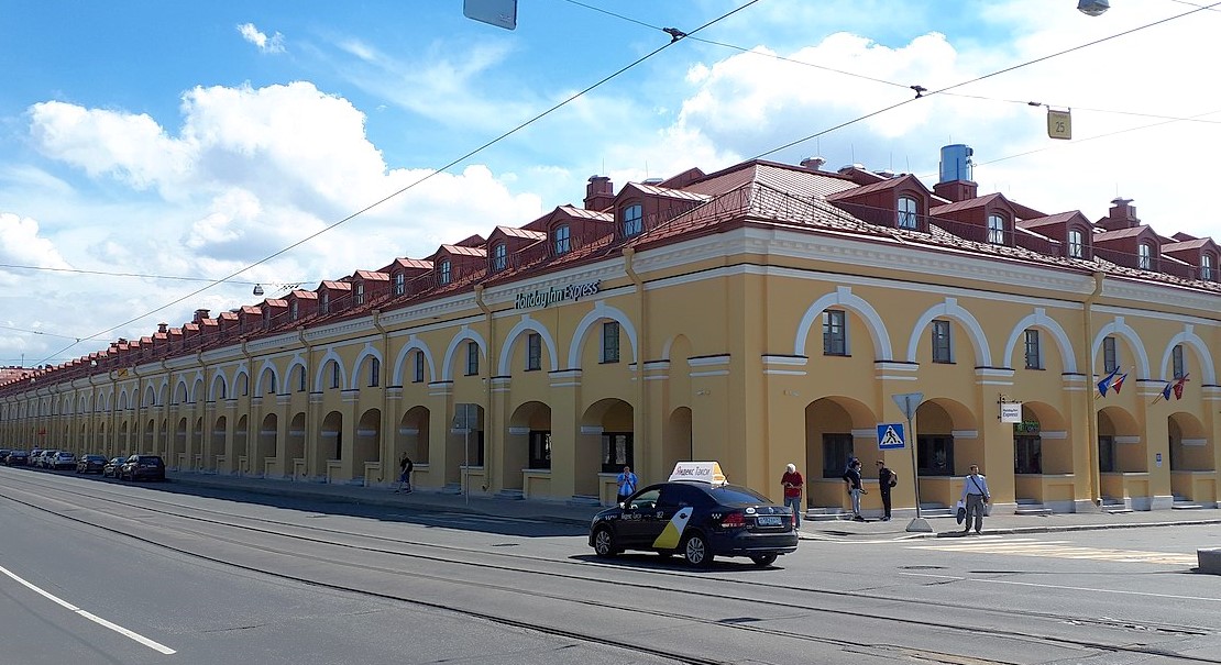Набережная канала привела нас на Никольскую площадь. Справа над купами деревьев поблескивают золотые купола Никольского Морского собора, а слева нашему взору предстают бесчисленные аркады Никольского рынка.