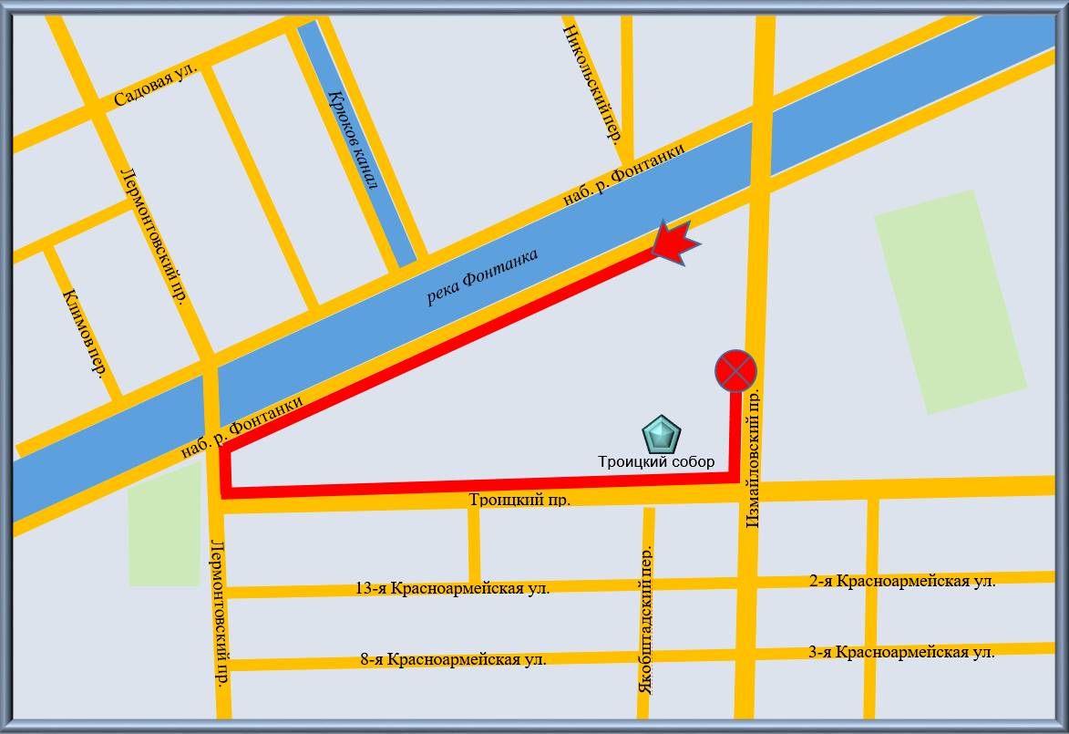 Однако, пора в путь. Маршрут этой прогулки лежит по чётной стороне набережной Фонтанки до Египетского моста, а затем по Троицкому проспекту назад к Измайловскому.