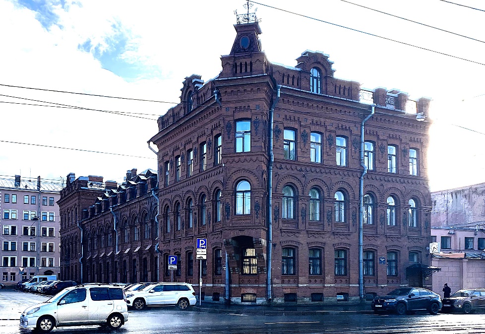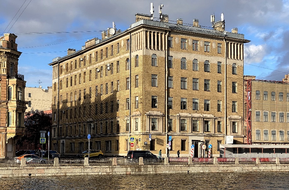 За Египетским мостом на нечетной стороне набережной среди разновысотных и непрезентабельных строений буквально притягивает внимание здание необычного силуэта (наб. Фонтанки, 159). Это бывший доходный дом потомственного почетного гражданина Константина Ивановича Капустина, построенный в 1910-1912 годах по проекту гражданского инженера Алексея Фёдоровича Бубыря в стилистике северного модерна. Зодчему в полной мере удалось создать дом-монумент, способный «держать» вокруг себя довольно обширное пространство. Рассчитанный на восприятие издалека он представляет собой гигантскую супрематическую композицию (супрематизм – сочетание простых геометрических форм), в которой вертикальные плоскости подчёркнуты более светлой штукатуркой. Сопряжение объемов кровли на углу здания – настоящий архитектурный шедевр.