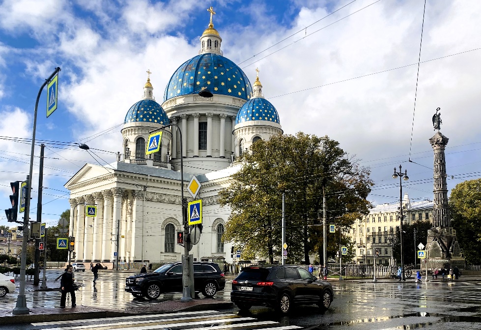 Продолжая движение вдоль забора, прерываемого фасадами больничных корпусов, мы выйдем к собору лейб-гвардии Измайловского полка, освященному во имя Святой Живоначальной Троицы (Троицкий, 1). Здание собора было возведено в 1828-1835 годах в стиле ампир по проекту архитектора Василия Петровича Стасова на личные средства императора Николая I. По указанию государя все купола были выкрашены голубой краской с золотыми звездами, поскольку «синий цвет соответствует цвету мундира измайловцев» (на большом куполе 280 звезд, а на малых – по 208).
