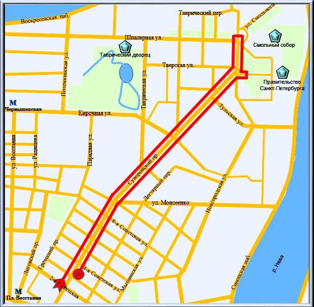 Поскольку большого интереса эти строения не представляют, мы начнем прогулку по Суворовскому проспекту от 2-й Советской улицы и, двигаясь в сторону Смольного, будем рассматривать дома с чётной нумерацией. А потом вернемся назад по противоположной стороне.