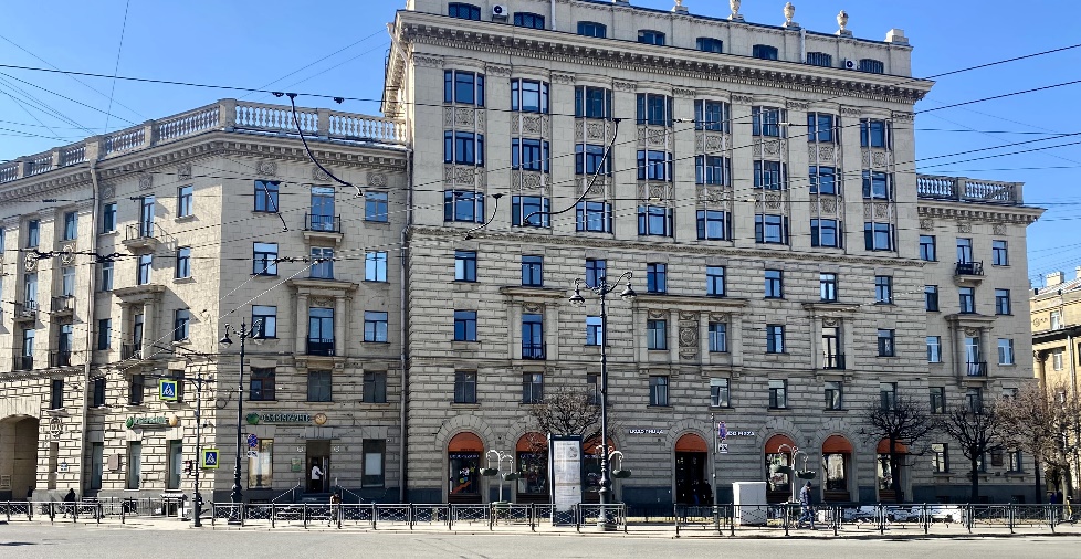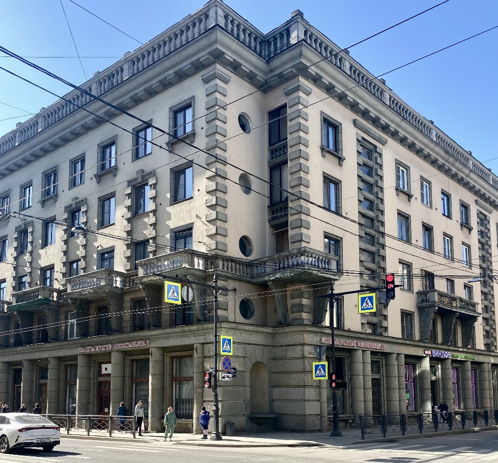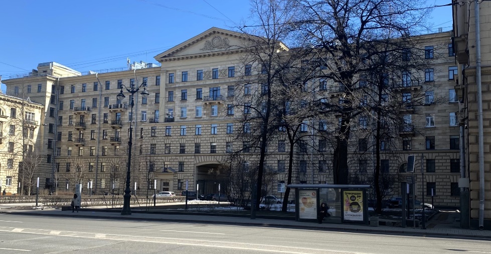 За перекрёстком с Кавалергардской находится «монументальное здание строгого стиля с колоннами по фасаду» (Суворовский, 50-52). Так сообщалось в адресно-справочной книге «Ленинград» за 1940 год. И там же: «Когда строительные работы были окончательно завершены, горожане смогли оценить по достоинству произведение сталинского неоклассицизма, призванное прославлять величие социалистического государства».