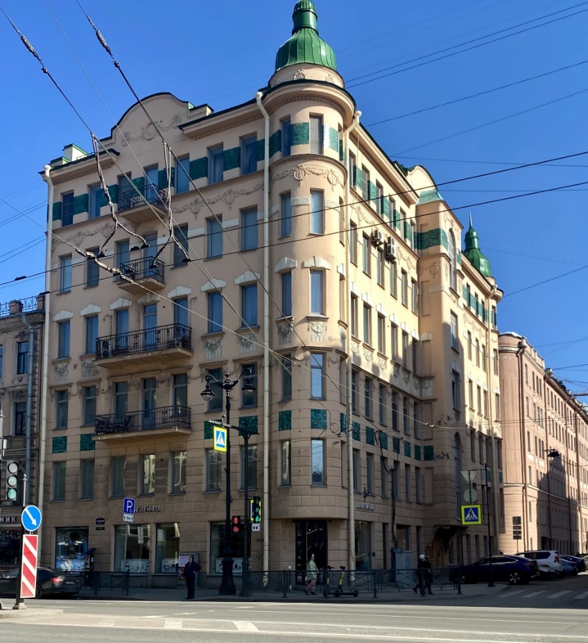Минуем, не останавливаясь, несколько кварталов, отметив на ходу дом 6, фасад которого в стиле модерн украшен растительным орнаментом, женскими фигурами и масками.