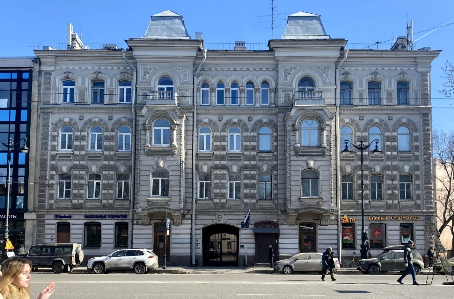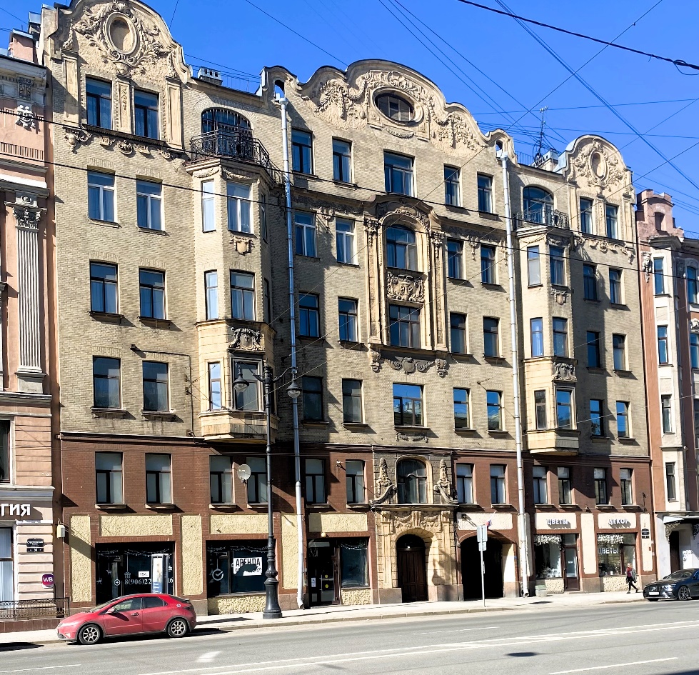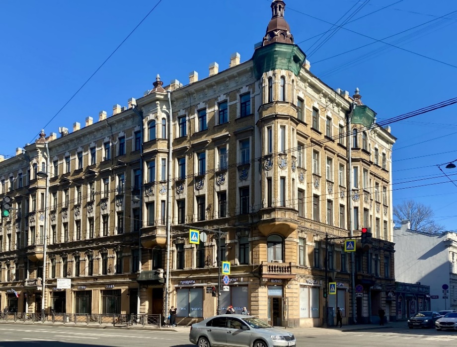 Остановимся напротив дома 34, где под острым углом от проспекта отходит Таврическая улица. Это собственный доходный дом архитектора Александра Васильевича Кащенко, построенный им в 1901 году. В декоре здания мирно соседствуют женские маски, львиные морды, а также рыбы, обвивающие трезубец Нептуна. В интерьере сохранились оригинальные витражи и немецкая напольная плитка.