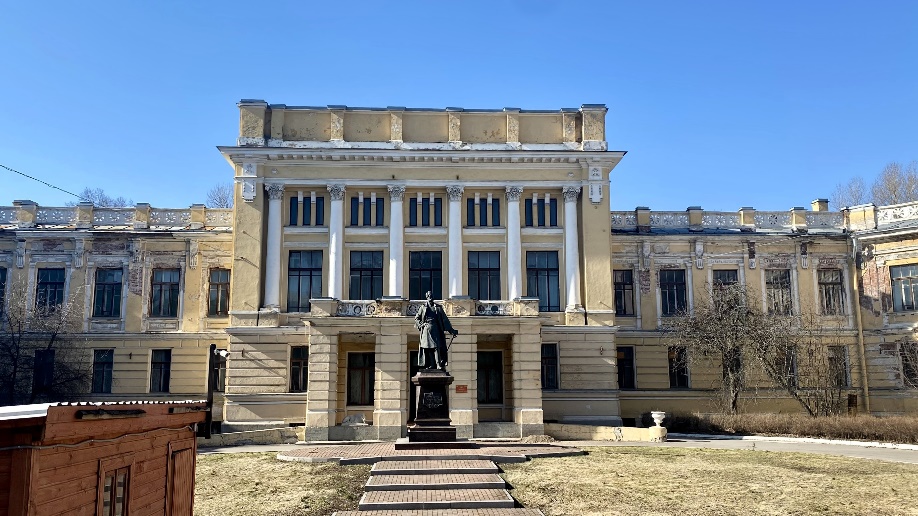 Мы подошли к металлическому ограждению, за которым в глубине сквера находится здание, построенное в 1900-1901 годах специально для Николаевской академии Генерального штаба (Суворовский, 32 Б). Архитектор Александр Иванович фон Гоген возвел главное учебное здание в виде старинного усадебного дома с колонным портиком. Высокий парапет, по углам которого восседали огромные орлы, украшали лепные изображения военной арматуры.