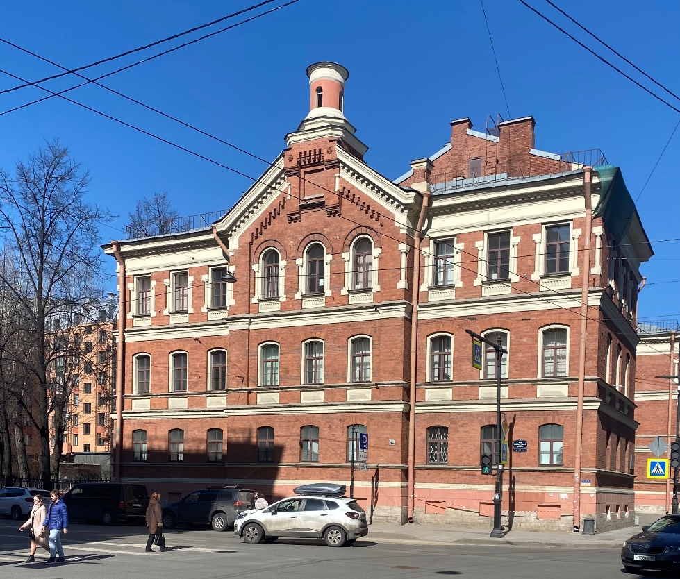 Другой угол на этом перекрестке занимает четырехэтажный дом (Суворовский, 4 / 2-я Советская, 6), перестроенный в 1872 году по проекту архитектора Aнтония Осиповича Томишко для первого в стране училища «фельдшериц и лекарских помощниц». Средства на это благородное дело выделил один из богатейших людей Российской империи, действительный статский советник, купец первой гильдии, барон Гораций Осипович Гинцбург.