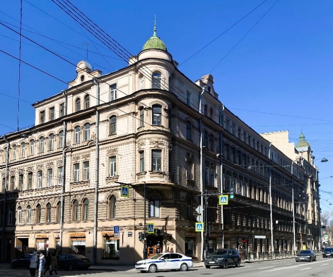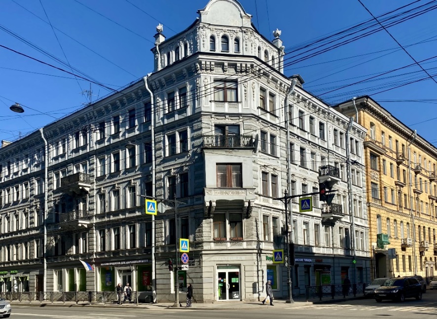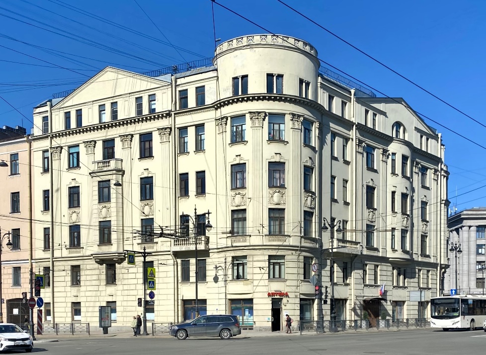 Продолжая прогуливаться по нечетной стороне Суворовского, обратим внимание на здание, возведенное в 1913 году на участке сложной конфигурации между Кирочной и Кавалергардской улицами (Суворовский, 48 / Кавалергардская, 2 / Кирочная, 58). Гражданский инженер Николай Леонидович Захаров спроектировал доходный дом со скруглённым углом, который воспринимается как мощная крепостная башня. Неоклассицизм фасадов подчеркивают каннелированные пилястры коринфского ордера и треугольные фронтоны боковых фасадов.