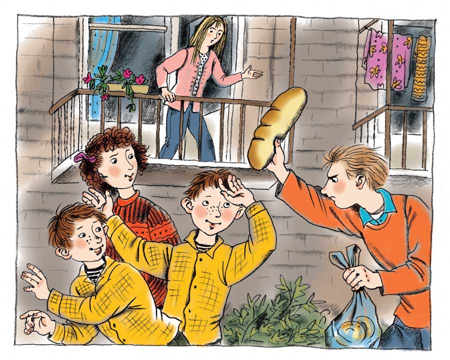 Этого я уже не мог выдержать. Пусть уж меня дразнят, но Люську они безнаказанно дразнить не будут! Я выхватил из сумки батон и бросился на них. Но они оказались юркие, как ящерицы. Они хихикали и ловко увёртывались, не переставая на весь двор трещать свою отвратительную дразнилку. Я совершенно запыхался и выбился из сил, гоняясь за ними. Вдруг я услышал голос: