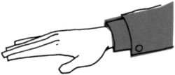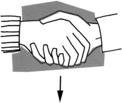 Доминирование передается путем поворота вашей руки (см. рисунок полосатый рукав) таким образом, что ладонь во время рукопожатия оказывается повернутой вниз. Ладонь не обязательно должна быть повернутой строго вниз, но при этом ваша рука все равно оказывается сверху. Тем самым вы показываете собеседнику, что стремитесь получить контроль над ситуацией.