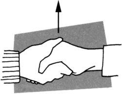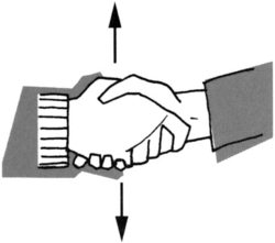 Противоположностью энергичному рукопожатию является такое положение, при котором ваша рука (см. рисунок полосатый рукав) располагается ладонью вверх. Тем самым вы символически передаете контроль собеседнику, подобно тому, как собака демонстрирует горло более сильному псу.