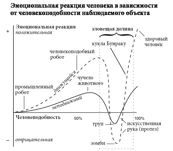 Впрочем, был отмечен и такой интересный побочный эффект сочувствия человекоподобным машинам: если машина слишком похожа на человека, эмпатия пропадает и уступает место отвращению. Вопрос о том, как подобрать правильную степень антропоморфизма, то есть такой дизайн машины, чтобы она вызывала максимальное сочувствие, не переходящее в отвращение, – это вопрос, имеющий практическую значимость, причем не только для инженеров, проектирующих бытовых роботов – помощников по хозяйству для стареющих обществ, как в Японии и Германии. Важен этот вопрос и для создателей компьютерных мультипликационных фильмов. Так, например, при создании «Шрека» пришлось сделать принцессу Фиону менее антропоморфной, «потому что она стала выглядеть слишком настоящей, и эффект получался ощутимо неприятным»100. Впервые теоретически разобрал этот эффект специалист по робототехнике Масахиро Мори в 1970 году. Он дал ему название «Зловещая долина» (uncanny valley). Наилучшее представление об этой долине дает график (ил. 3)101.