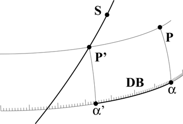 Offenbar muß man, um die gewünschte Zeitstrecke zu bestimmen, den Deklinationskreis (Parallelkreis) von P mit dem Horizont, der mundanen Positionslinie von S=ASC, schneiden. Der Schnittpunkt heißt in der Graphik P’. Man mißt nun die Rektaszensionen von P und P’ auf dem Äquator, im Bild mit α und α’ beschriftet.