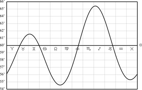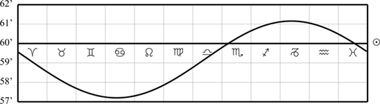 Die Abhängigkeit dieses Schlüsselwerts von der Länge der Geburtssonne hat folgende Gestalt: