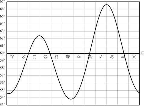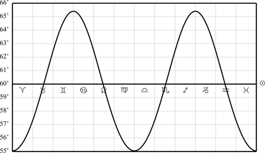 Der Schlüssel Sonnenlänge verläuft in einem entgegengesetzten Zyklus, mit viel kleineren Schwankungen. Maximal- und Minimalwert des Sonnenlängeschlüssels werden natürlich in Perihel- und Aphelstellung (rund 11° Krebs/Steinbock) erreicht.