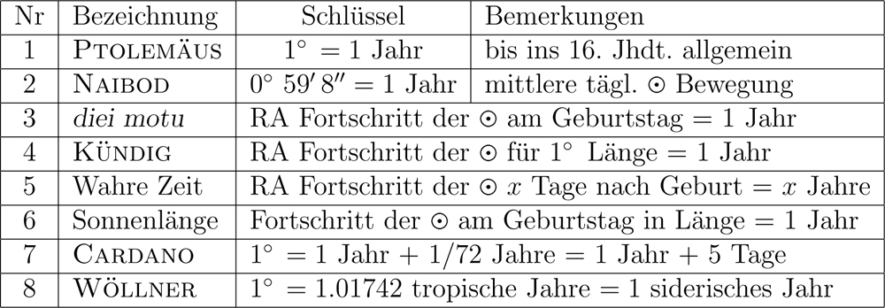 Die Alternative zu den Direktionen nach Wahrer Zeit ist, wie schon erwähnt, die Auffassung, daß die Primärdirektionen sich kurz vor oder nach der Geburt bilden, hervorgerufen durch die Erddrehung um ihre eigene Achse. Man benötigt also einen Schlüssel, um Zeiträume in der Dimension von Minuten bis einigen Stunden in Jahre umzuwandeln. Der Schlüssel 1 Tag gleich 1 Jahr ist hierfür nicht geeignet. Die älteste Alternative stellt der Schlüssel von PTOLEMÄUS dar, wonach ein Grad des Direktionsbogens einem (tropischen) Sonnenjahr entspricht.