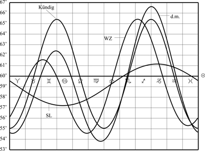Die Schlüssel Wahre Zeit, diei motu und Kündig verlaufen demnach ungefähr gleichsinnig, haben ungefähr gleichzeitig ihre Maxima und Minima, wobei allerdings der Kündigschlüssel bei einer Sonnenlänge von ca. 0° Krebs eine besonders große Abweichung zeigt.