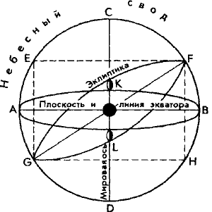Действия демиурга можно представить себе следующим образом. Всю образовавшуюся массу он делит и складывает так, что получает плоскости экватора и солнечной эклиптики, которые пересекаются под наклонным углом (согласно современному представлению, 23°27'42») в точках равноденствия, вращаясь вокруг мировой оси, причем внешняя плоскость экваториальная, а внутренняя эклиптическая. Обе же они в свою очередь объяты небесным сводом, по кругу которого происходят их движения. Внешняя плоскость обнимает внутреннюю, управляет ею и идет в правом направлении, т. е. с востока через запад снова на восток, так как всякое рождение и начало связано по античной традиции с правой стороной, с востоком, и знаменует собой природу благого, истинного, тождественного. Эклиптика же вращается внутри, справа налево, т. е. с запада через восток снова к западу, и означает природу иного, изменчивого, неразумного. Движение экваториальной плоскости Платон называет движением вдоль стороны прямоугольника, а движение плоскости эклиптики – движением вдоль диагонали того же прямоугольника. Собственно говоря, это не что иное, во-первых, как движение экваториальной плоскости вокруг мировой оси по прямому направлению вправо, выраженное при помощи мысленно вписанного в небесный свод прямоугольника, две стороны которого параллельны поперечнику экватора (см. рис. 2). Во-вторых, это движение эклиптики под углом влево, вдоль диагонали мысленного прямоугольника, т. е. вдоль поперечника эклиптики, а значит, движение непрямое, иррациональное. Движение экваториальной плоскости, тождественное себе и пребывающее в самом себе, а значит, по Платону, разумное, имеет перевес, являясь единым и неделимым. Движение эклиптики, изменчивое и постоянно стремящееся к иному, демиург делит на семь неравных кругов, которые, как видно из дальнейшего изложения (38cd), и являются сферами планет.