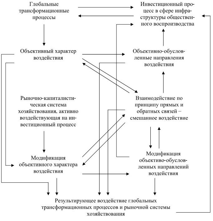 – глобальные трансформационные процессы оказывает существенное воздействие на инвестиционный процесс в сфере инфраструктуры общественного воспроизводства, а он, в свою очередь, в порядке обратной связи оказывает влияние на протекание глобальных трансформационных процессов;