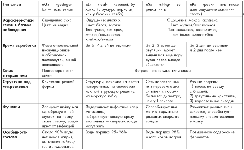 Характер слизи изучали ученые, так что сегодня у нас есть достаточно подробная классификация, которая позволяет разобраться с секретом. Профессор Одеблад в результате многолетних исследований обнаружил несколько типов секрета. Мы рассмотрим только основные, представляющие для нас интерес (см. таблицу ниже).