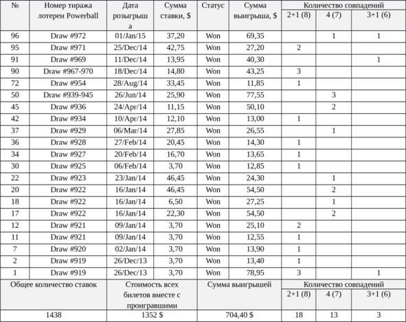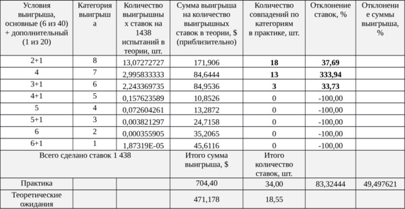 В таблице 5 приведены вероятности выигрыша призов различной категории и распределения денежных призов. Правила игры следующие: игрок выбирает шесть основных номеров от 1 до 40 и один дополнительный номер от 1 до 20. Для того чтобы выиграть самый маленький приз, необходимо совпадение 2 основных шаров и 1 дополнительного. Для получения максимального приза необходимо совпадение всех 6 основных шаров и 1 дополнительного шара. Тиражи проходят 1 раз в неделю по четвергам, и они допускают участие иностранных граждан к игре и покупку билетов через интернет. Игру я вел с небольшими перерывами, начиная с тиража №919 от 26.12.2013 до тиража №973 от 08.01.2015. Всего за данный период мною было куплено 98 билетов, которые содержат 1438 ставок (независимых испытаний). Потрачено на игру 1352$, из которых 704,4$ выиграны. Всего из своих личных средств израсходовано таким образом 647,6$. Прямым делением суммы на количество ставок стоимость одной ставки не определить, так как на сайте их цена зависит от количества ставок в билете. После кризиса 2014 года цена ставок сильно подросла и играть стало довольно накладно, да и энтузиазма поубавилось. Высокая нагрузка на работе также не способствует продолжению опыта. В связи с чем я и решил подвести итоги. Ставки совершались по следующему принципу: числа брались из моих сновидений, если не хватало, то дополнительно выбирались случайно. На тираж я старался тратить не более 10$, но если выигрывал, то все выигранные деньги тратил на ставки в ближайших тиражах. Перед сном я пытался настраиваться на интересующий меня тираж с целью получения основных номеров. Дополнительный номер меня не интересовал, чтобы не было путаницы, какое из полученных чисел куда ставить.