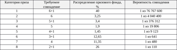 Таблица 5. Вероятность совпадения номеров и распределения призов в австралийской лотерее Powerball.