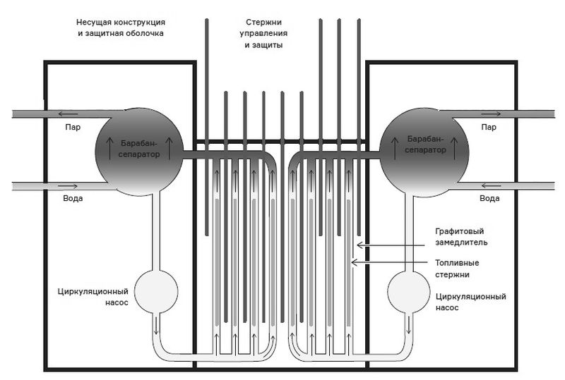 Протокол перечислял основные характеристики реактора. Ядро реактора – графитовый цилиндр семь метров высотой и диаметром около двенадцати метров, заключенный в стальной кожух и размещенный в бетонной шахте шириной около двадцати двух метров и высотой в двадцать шесть метров. Графитовые блоки, из которых составлена активная зона, замедляют нейтроны и предотвращают затухание цепной реакции – столкновения нейтронов с ядрами урана. Ядра же, расщепляясь, высвобождают новые нейтроны. Вверху и внизу кожуха реактора расположены две громадные металлические плиты, которые служат для биологической защиты. Верхняя плита (формально: «схема Е», неформально: «Елена») пронизана трактами технологических каналов – для топливных и нейтронопоглощающих стержней. Реактор четвертого энергоблока насчитывал 1661 топливный канал. В такой канал помещали сборку из 18 таблеток с диоксидом урана, в котором 2–3 процента составлял уран-235. Система управления защитой имела 211 стержней с поглотителем нейтронов – карбидом бора. Поглотитель, не позволяя части нейтронов врезаться в ядра урана, замедляет цепную реакцию. Если же реакцию надо подстегнуть, то регулирующие стержни из активной зоны реактора выводят. По контуру проходит охлаждающая вода, частично выкипая за счет выделяемого при реакции тепла. Паро-водная смесь попадает в сепаратор, откуда вода возвращается в реактор, а пар выходит к турбине, которая генерирует электричество.