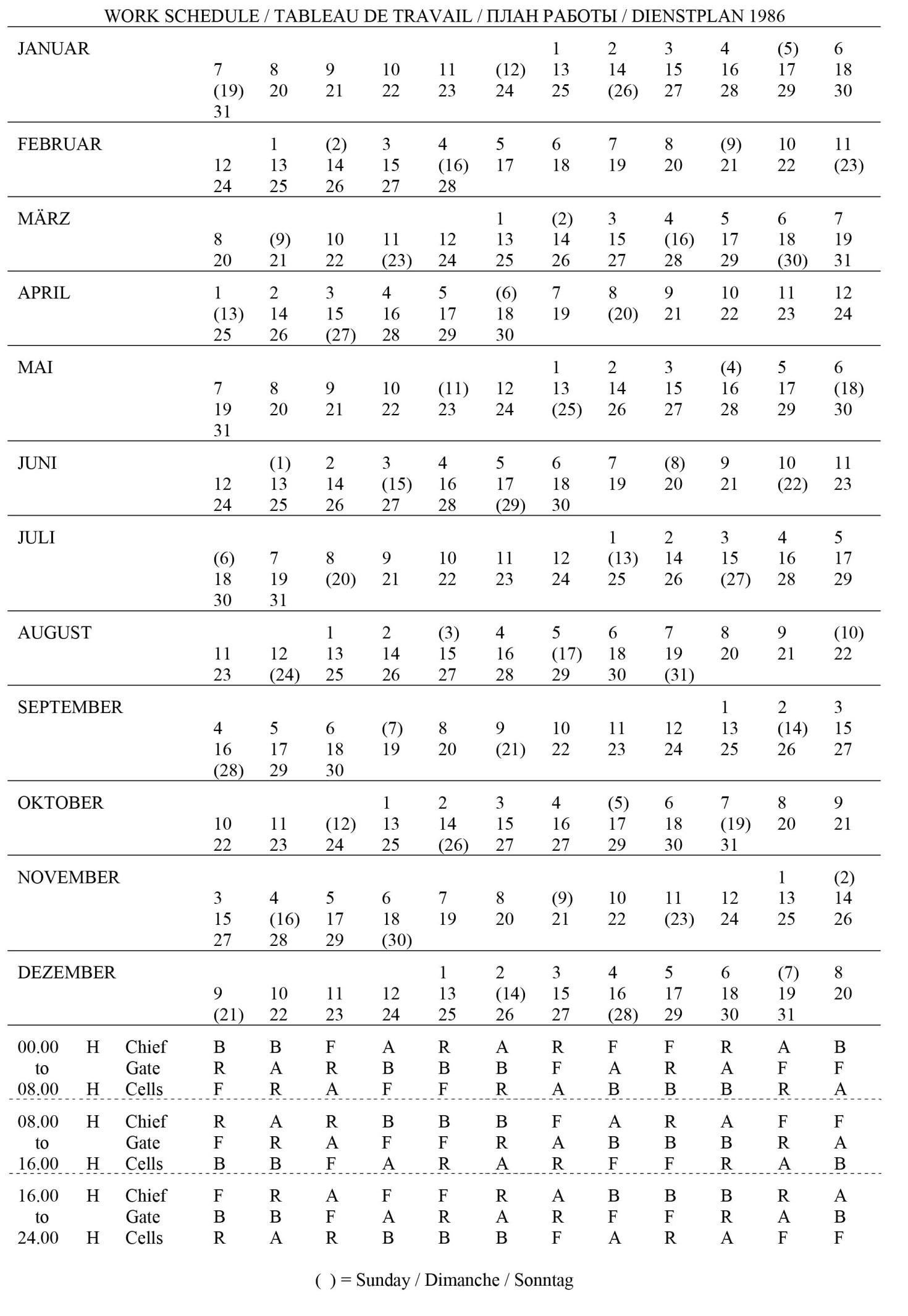 График дежурств надзирателей на год составляется секретарями и согласовывается с директорами МТШ. Помимо информационного содержания, он наглядно показывает существующую в МТШ практику свободного смешивания различных используемых в тюрьме языков, несмотря на то, что официальным языком МТШ считается немецкий. Название документа сделано на четырех языках: английском, французском, русском и немецком. Названия месяцев даны только по-немецки. Названия постов и время дежурства написаны только на английском языке и обозначают:
