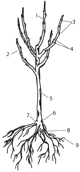 Рисунок 1. Двухлетний саженец яблони: 1) центральный проводник; 2) скелетные ветки; 3) наружные почки; 4) внутренние почки; 5) штамб; 6) место прививки; 7) корневая шейка; 8) скелетные корни; 9) обрастающие корни