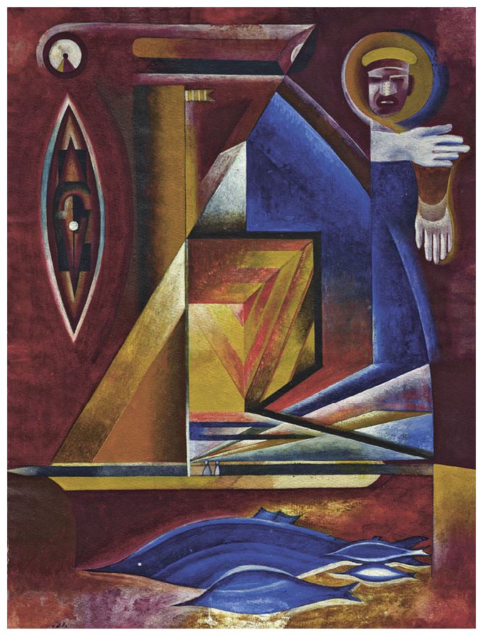 Увлечение сюрреализмом заметно и в творчестве художника Льва Лапина, соприкасавшегося с «кругом Малевича»[26]. Нельзя не вспомнить в этом контексте и об Иване Клюне, группа работ которого начала 1930-х[27] отмечена, по его собственным словам, переходом к «формам случайным, непосредственным, неясным»[28]. Прямые линии уступают здесь место извилистым, жесткие квадраты и треугольники вытесняются эмоционально «заряженными» фигурами сложной кривизны, а иногда и вовсе зыбкими, неправильными, мягкими, словно трепещущими, формами, пришедшими из сна или воображения.