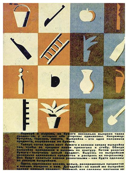 В этот контекст следует включить и биоморфную абстракцию декоративно-прикладных миниатюрных работ[13], которые находят пластические аналогии в творчестве Арпа или Миро. И даже детскую иллюстрацию, такую как спинка обложки для журнала «Чиж»[14]: «отклоняющееся поведение» фигур, которые ломают установленный композиционный и ритмический порядок; рассеченные пополам, кажущиеся аномальными предметы; волнующее сочетание условности и иллюзорности (тела и тени, изображения и знака, бытия и небытия). Здесь наблюдается определенное совпадение с «Алфавитом откровений» Магритта (1929).