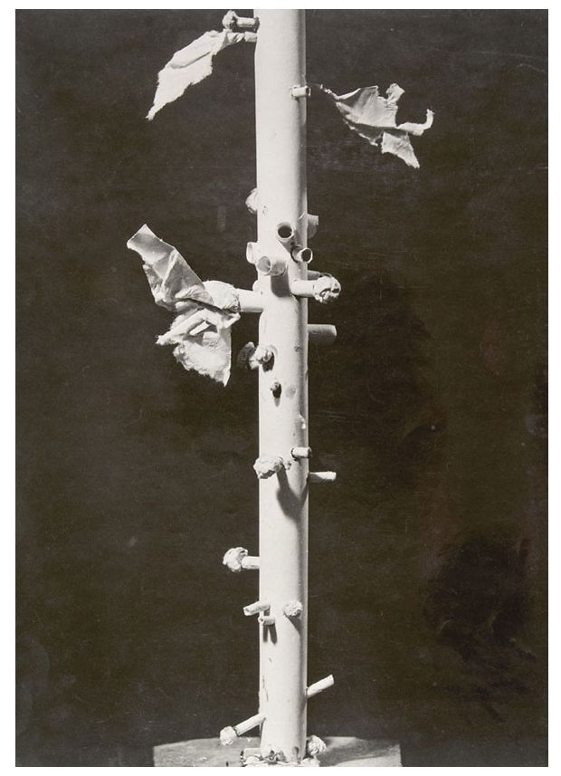 Дополнительные краски придают рассматриваемому «сюрреалистическому сюжету» факты из не известного ранее письма Юдина Константину Рождественскому от 9 августа 1936 года[18]. Оказывается, мимо внимания Юдина не прошла важнейшая акция движения – «Сюрреалистическая выставка объектов», о которой он узнал из специального номера любимого журнала Cahiers d’Art. Пополняется список имен: кроме упомянутых в дневниках, появляются Марсель Дюшан, Ман Рэй, Сальвадор Дали (ключевые!), Александр Кальдер. Юдинские суждения свидетельствуют не о скользящем восприятии, а об углублении в проблематику, о понимании задач и целей: он пишет о созданных моделях и выставленных реальных вещах как носителях сюрреалистического ощущения, отмечает, что «подбирают они [художники-сюрреалисты] себе элементы чрезвычайно точно». Оценивает причины того, что «носятся» с Дюшаном: «очевидно, много идей пошло от него». Совершенно справедливо выделяет Мана Рэя: «очень интересные фото (с моделей собственных)». Более того, прямо говорит о близости к ним своих фотографий, на которых запечатлены уже юдинские «собственные модели» – причудливые, странные бумажные скульптуры (колонны, мачты)[19]. «Увидишь и поразишься», – пишет он Рождественскому. Выше я уже говорила о родстве и самих этих объектов, и их «фотографической обусловленности» с поэтикой сюрреализма, однако то была все-таки гипотеза. И вот оно, документальное подтверждение, что дорогого стоит! Процесс фотографирования имел у Юдина творческий, а не фиксационный характер: тогда фигурки, по мнению самого Юдина, представали «объективизированными», осуществленными[20]. Отпечатки, как и у Мана Рэя, тоже были оригиналами[21]. Самое любопытное, что эта близость – следствие не заимствования, а параллельности в развитии, общности в направлении мыслей. Судя по всему, Юдин был удивлен подобным совпадением: он называет его «забавным» и радуется, что «опубликовал их [свои фотографии] до того, как в городе появился этот номер»[22].