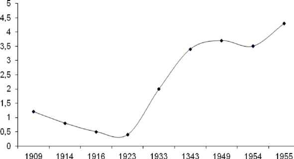 1916 год: 26/19:19/7=0,5 1954 год: 24/11:11/13=3,5