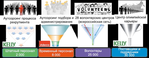 Лондонский Оргкомитет-2012 набирал 70 000 волонтеров. Даже при развитом в стране волонтерском движении набрать такое количество добровольцев надо еще суметь, это сложная и кропотливая работа. Нужно определить критерии, создать методологию отбора, найти нужные инструменты. В их случае никого не нужно было обучать английскому, а это минус огромная головная боль.