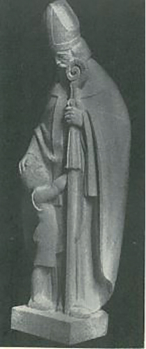Die Architektur selbst bietet keinen einzigen Anhaltspunkt für eine Identifizierung als austrofaschistischer Bau. Allerdings war anstelle der heutigen Bauinschrift ursprünglich, wie ein historisches Foto zeigt, „Familienasyl St. Engelbert“ zu lesen (Abbildung 3). Diese Asyle waren ein Sondertyp des austrofaschistischen Wohnbaus, auf den später noch eingegangen wird.1 An der Turmfassade ist auch Kunst-am-Bau angebracht, eine Figur, wie das auch an sozialdemokratischen Gemeindebauten üblich war. Dargestellt ist hier aber ein Bischof, mit Mitra, Stab und einem Kind, eine sakrale Figur, wie sie im antiklerikalen sozialdemokratischen Wien nicht akzeptabel gewesen wäre (Abbildung 4):