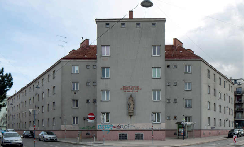 Erst durch das Wissen um das Distinktionsmerkmal der Bischofsfigur wird das Gebäude in der Tautenhayngasse als Produkt einer autoritären Ideologie erkennbar. Ansonsten wurde es im Gewand des verhassten politischen Gegners, der Sozialdemokratie, gestaltet. Angesichts der unübersehbaren Präsenz der roten „Gemeindebauten“ im Stadtbild sah sich das neue Regime zur Fortsetzung der Wohnbauaktivität mit eigenen Projekten gezwungen, die auf der Basis einer ideologischen Gegenposition konzipiert werden mussten.3