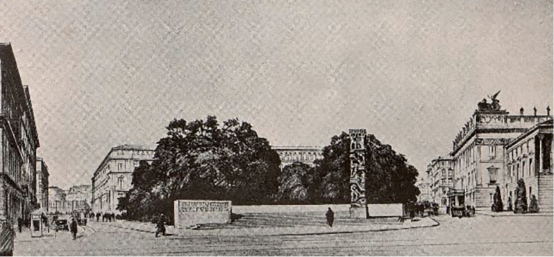 Das Konzept des Denkmals (Abbildung 13) stammte von Anton Hanak. Es war von der Sozialdemokratischen Partei, den Gewerkschaften und der Arbeiterkammer beauftragt worden und enthielt auf ausdrücklichen Wunsch der Auftraggeber keine allegorische Darstellung – ein seltener Fall einer direkten Formvorschrift, die der Künstler keinesfalls guthieß, die aber möglicherweise ideologisch motiviert war: Durch die schlichte architektonische Konzeption in klaren, kubischen Formen und mit der Beschränkung der Skulptur auf die Porträtköpfe setzt sich das Denkmal von der traditionellen Typologie der figural betonten gründerzeitlichen Ringstraßendenkmäler deutlich ab, und mit der ausschließlichen Darstellung sozialdemokratischer Politiker bot es zwar Identifikationspotential für das Rote Wien, nicht aber für alle anderen Parteien der jungen Republik.
