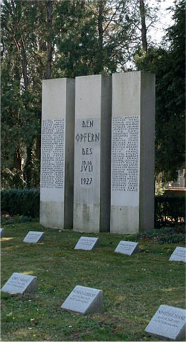Die avantgardistische, bis auf die Büsten völlig auf die Architektur eingeschränkte Form des Republikdenkmals war möglicherweise für den politischen Gegner „modern“ und sozialdemokratisch konnotiert. Immerhin finden sich in der sozialdemokratischen Denkmalkultur Wiens weitere Beispiele eines ähnlich reduzierten Denkmalstils: Das Denkmal für die zivilen Opfer des 15. und 16. Juli 1927 (Justizpalastbrand) am Wiener Zentralfriedhof, ebenfalls von Anton Hanak (1928), besteht aus drei enggestellten vertikalen Inschriftstelen (Abbildung 27.), und das Denkmal zur Errichtung des Wiener Stadions ist ein klar umrissener Steinblock mit Inschriften. Diese sachlich-nüchterne Formgebung scheint auf die „offiziellen“ sozialdemokratischen Denkmale beschränkt gewesen zu sein; im halböffentlichen Raum der Gemeindebauhöfe wurden gegenständliche Darstellungen bevorzugt.
