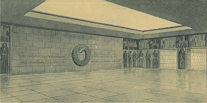 Für die Figur des „Toten Kriegers“ in der Krypta, eine überlebensgroße Liegefigur aus Adneter Marmor, wurde Wilhelm Frass mit dem neu geschaffenen Österreichischen Staatspreis ausgezeichnet.174 Die Figur wurde als „Darstellung des Kriegertodes, also die Anonymität der Vielheit“, rezipiert.175 Wie sich später herausstellen sollte, war Bildhauer Wilhelm Frass 1933/1934 bereits illegaler Nationalsozialist.176 In der Ehrenhalle brachte Frass einen Lorbeerkranz und das Reichswappen von 1836 an, für die Wände schufen Herbert Drimmel und Leopold Schmid Steinschnittfriese nach einem militärisch-historischen Programm, ergänzt durch die Kriegerheiligen St. Georg und St. Michael „als Patrone männlicher Wehrhaftigkeit […]. Herb und sparsam mussten die Mittel des Ausdrucks sein, um eine Einheit zwischen Architektur und bildnerischer Darstellung zu erreichen.“177