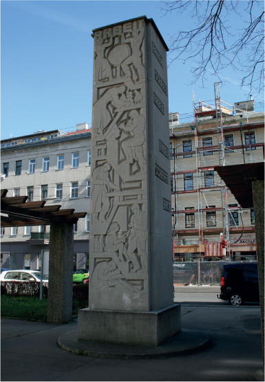 Vom Siegerprojekt hat nur die Stele von Ferdinand Opitz überlebt. In halbfertigen Zustand – die Unterschneidungen der Reliefs wurden nicht fertiggestellt – wurde sie 1951 in einem Gemeindebau in Heiligenstadt aufgestellt, wo sie sich problemlos als Kunst-am-Bau in den Zusammenhang der kommunalen Nachkriegswohnhausanlage fügt (Abbildung 31).
