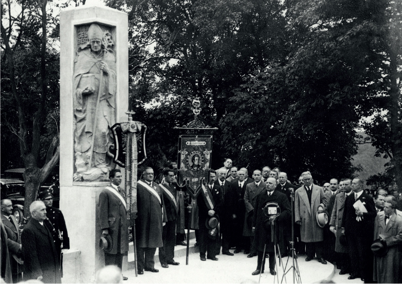1935 wurde Dollfuß ein Denkmal in Form seines Namenspatrons, eines nie offiziell heiliggesprochenen Kölner Bischofs, gesetzt. An einer Kehre der Wiener Höhenstraße nahe Grinzing, wo Dollfuß 1934 den ersten Spatenstich für sein Prestigeprojekt gemacht hatte, wurde ein Denkmal nach Entwurf von Alexander Popp und Rudolf Schmidt errichtet (Abbildung 35). Popps Steinsockel ist bis heute erhalten (siehe dazu das Kapitel Infrastruktur). Die Figur von Rudolf Schmidt war aus einem stelenförmigen stehenden Steinblock herausgearbeitet und zeigte den mediävalisierend dargestellten Bischof in Art einer Liegegrabfigur,215 allerdings vertikal aufgestellt. Zu seinen Füßen befand sich ein Drache, den der Heilige mit seinem Bischofsstab durchbohrt, ein Attribut, das nicht zur kanonischen Darstellung des hl. Engelbert gehört, das aber viel Assoziationsspielraum gibt: Der den Drachen tötende hl. Georg, die gegenreformatische Madonna, die der Schlange stellvertretend für das Böse den Kopf zertritt, liegen nahe, aber auch die Identifizierung des Drachen mit dem politischen Gegner. Die blockgebundene Form der Skulptur assoziiert passend zum umgebenden Wienerwald Bildstöcke oder Wegkapellen, wie sie im ländlichen Bereich üblich waren. Der erste Bauabschnitt der Straße, zu deren Patron St. Engelbert ernannt wurde, mitsamt dem Denkmal wurde am 16. Oktober 1935 eröffnet.216