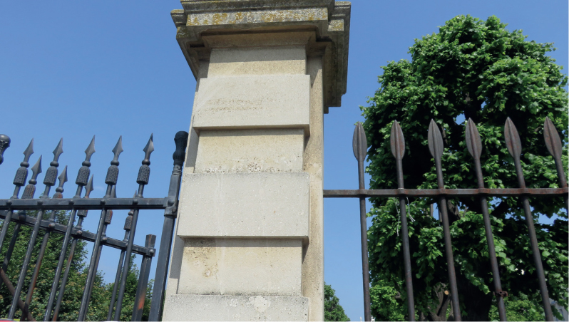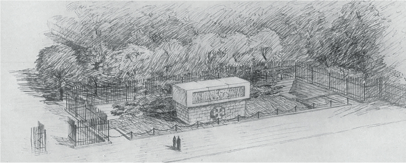 Der geplante Standort dieses Denkmals, dessen Grundstein am 18. Oktober 1936 zusammen mit jenem des nahe gelegenen Hauses der Vaterländischen Front (siehe Seite 133) gelegt wurde, ist bis heute sichtbar: Eine rechteckige Ausnehmung des Volksgartens ist dort von einem Zaun umgeben, der links von einem Pfeiler aus den lanzenförmigen Gusseisenelementen der gründerzeitlichen Einfriedung besteht, während die stilistierten Lanzen rechts vom Pfeiler das Denkmalgebiet von 1936 ausgrenzen und bezeichnen (Abbildung 39).