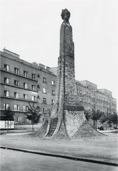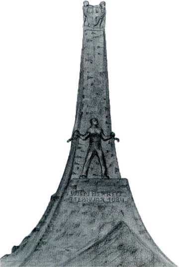 Für den Entwurf zeichneten Josef Neubacher (Architektur) und Karl Philipp (Skulptur) verantwortlich (Abbildung 33). Auf die Tribüne des Obelisken stellten die Künstler eine frontal dargestellte männliche Figur, in langen Hosen, aber mit nacktem Oberkörper, was der geläufigen sozialdemokratischen Arbeiterikonografie entsprach und daher auf sehr ungeschickte Weise uneindeutig war: Breitbeinig und mit ausgestreckten Armen die gesprengten Fesseln präsentierend, hätte die Figur genauso gut die Befreiung des Arbeiters aus den Fesseln des Kapitalismus darstellen können. Daher war eine klärende Inschrift nötig: „Wien befreit/12. Februar 1934“, sollte sie lauten. Am Ende kam das Projekt nicht zur Ausführung, erst 1936 wurde die Büste entfernt, der Obelisk nach 1938 abgetragen.201