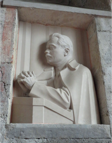 Das Relief zeigt Dollfuß als Betenden, in einer intim-versunkenen Geste, die seine Gläubigkeit betont (Abbildung 34). Die Darstellung, die an einen Adoranten oder Stifter erinnert, erscheint wie ein Ausschnitt aus einem spätmittelalterlichen Altarbild und nimmt damit die spätere Sakralisierung des Kanzlers vorweg. Die Übertragung lebender Personen in Altarbilder, Sacre conversazioni etc. ist bereits von Karl Lueger her bekannt: Der Bürgermeister wurde zum Beispiel im Altarbild der Lainzer Versorgungshauskirche als Stifter dargestellt. Das Dollfußrelief wurde in der Kapelle zu der ebenfalls von Hans Schwathe gestalteten Altarwand in Beziehung gesetzt, die eine Madonnenfigur in einer expressionistisch gestalteten Mandorla und mit der Inschrift: „Unbefleckte Jungfrau, bitte für Österreich“ enthält. Die Kapelle wurde erst nach Dollfuß’ Tod fertiggestellt und konsekriert.211